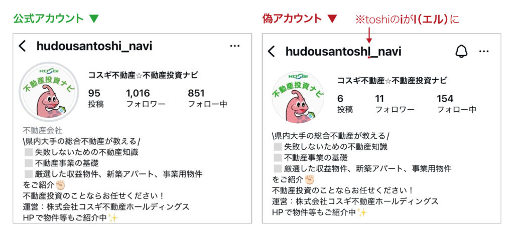 なりすましアカウントは「hudousantoshl_navii」(toshiのiがl(エル))という非常に似たアカウント名を使用し、公式アカウントと同様のプロフィール画像や情報、リール投稿を行っております。